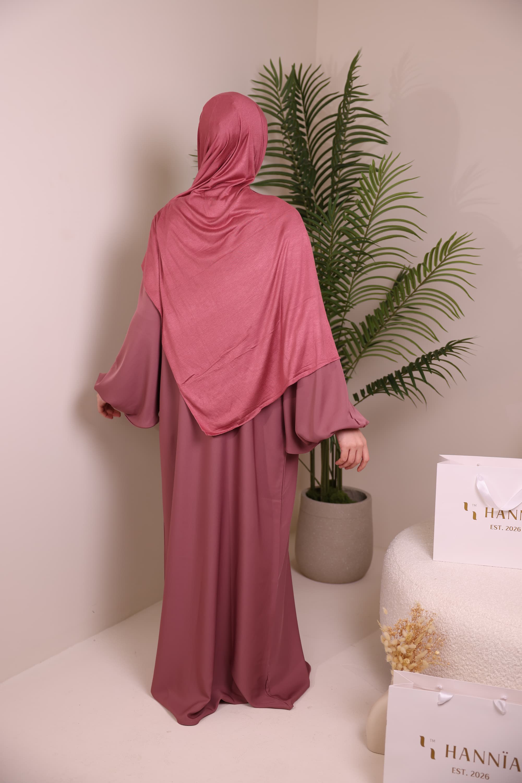 An everyday abaya with an elegant and unique touch. Each piece in this collection is crafted from exceptionally comfortable, premium-quality fabric, designed to offer effortless style and all-day ease. Every abaya features a relaxed cut and high-quality materials, giving you a simple yet refined look without effort. This model is available with: Elastic sleeves Buttoned sleeve detail Matching hijab Two pockets Belt Wash at 30°C Can be ironed
